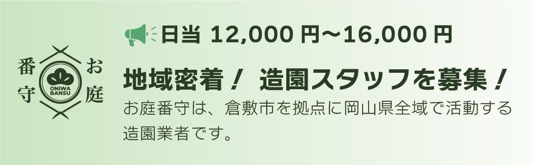 運気上昇、緑あふれるお庭づくり 「お庭番守」にぜひ一度ご相談ください。 倉敷市を中心とした地域密着のお庭づくり。 心地よい風景を提供します。 その人らしい生活に寄り添い、 お庭の手入れに困っている人達に、 VIEW MORE