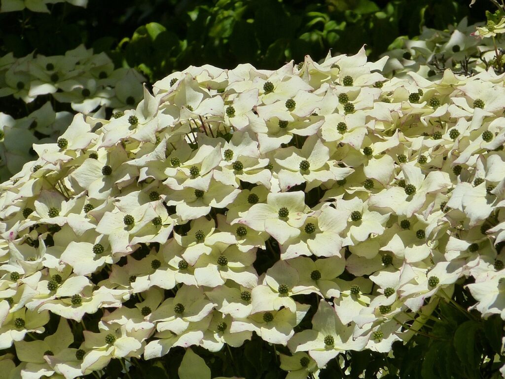 ヤマボウシ(山法師)はミズキ科の落葉高木で、5〜6月頃に白い総苞片(花びらのように見える部分)を広げて咲きます。
