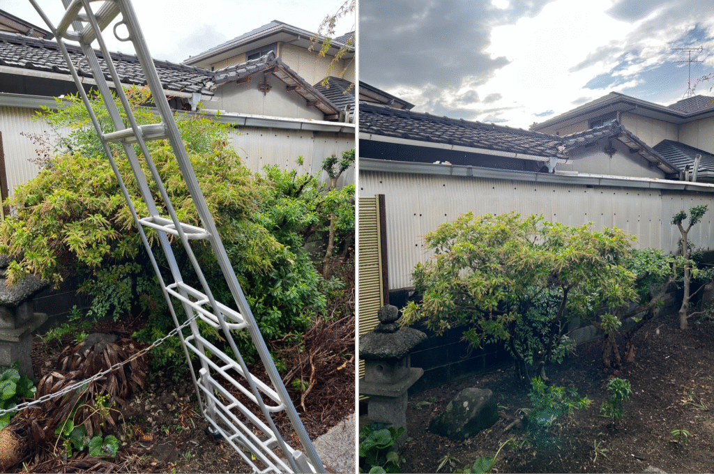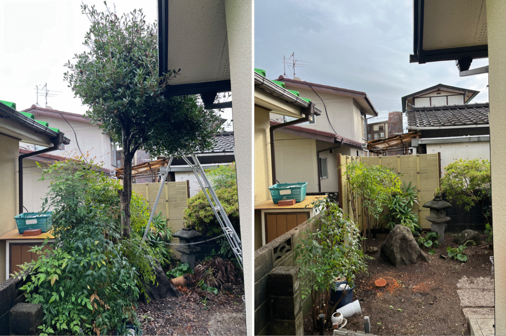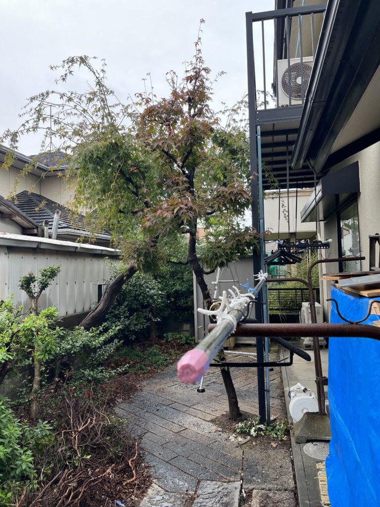 また、紅葉が幹の中が空洞になっており、倒れた時のことを心配されていらっしゃいました。今後のことも考え、家側に傾いている枝を強めに切らせていただきました。